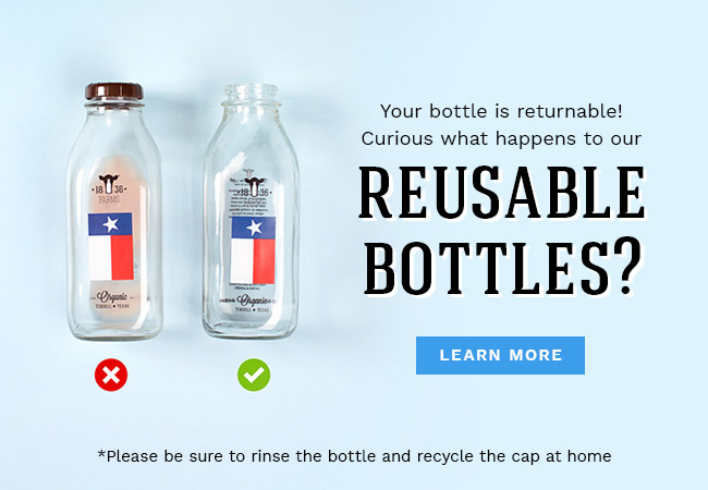 Here, at 1836 Farms, we have experience in bottling milk the old school way with old school practices using today’s technology. We also believe that milk in glass bottles is the healthiest and most ecological choice to maintain and sustain our environment, not only here in Texas, but across the U.S. At 1836 Farms, we only bottle our milk in glass, reusable bottles. Why? Glass is 100% reusable and can be recycled endlessly. Glass is nonporous, so no interactions between glass packaging and products affect the flavor. Glass also acts as an excellent insulator, meaning it keeps the milk colder –so you get the freshest milk possible! You can be assured that when you buy 1836 Farms milk and return it to your local grocer, it will be sanitized, rinsed, and refilled with our delicious, organic 1836 Farms milk!